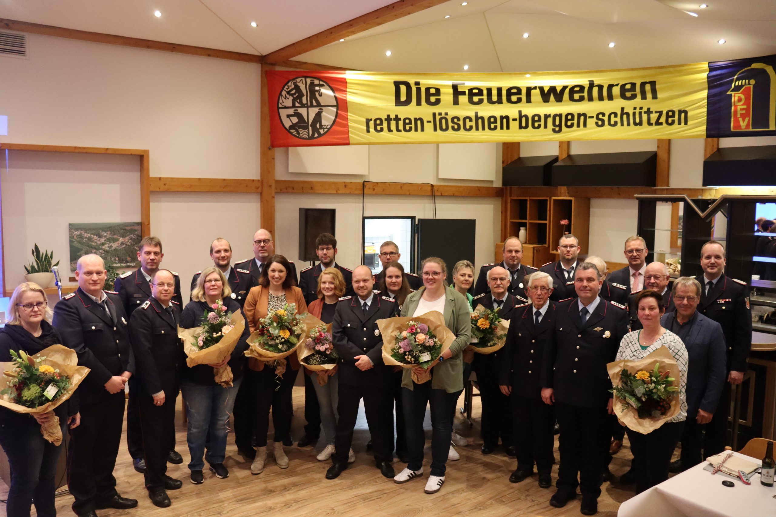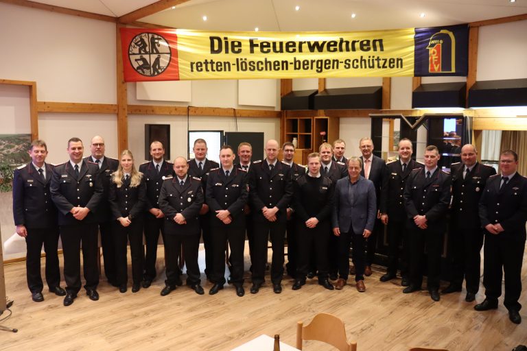 Alle Geehrten mit den Partnerinnen und Partnern sowie dem Gemeindebrandmeister Helmut Tieneken, seinem Stellvertreter Maik Hübel, dem Kreisbrandmeister Daniel Loehrke, Samtgemeindebürgermeister Ansgar Duling sowie dem Bürgermeister der