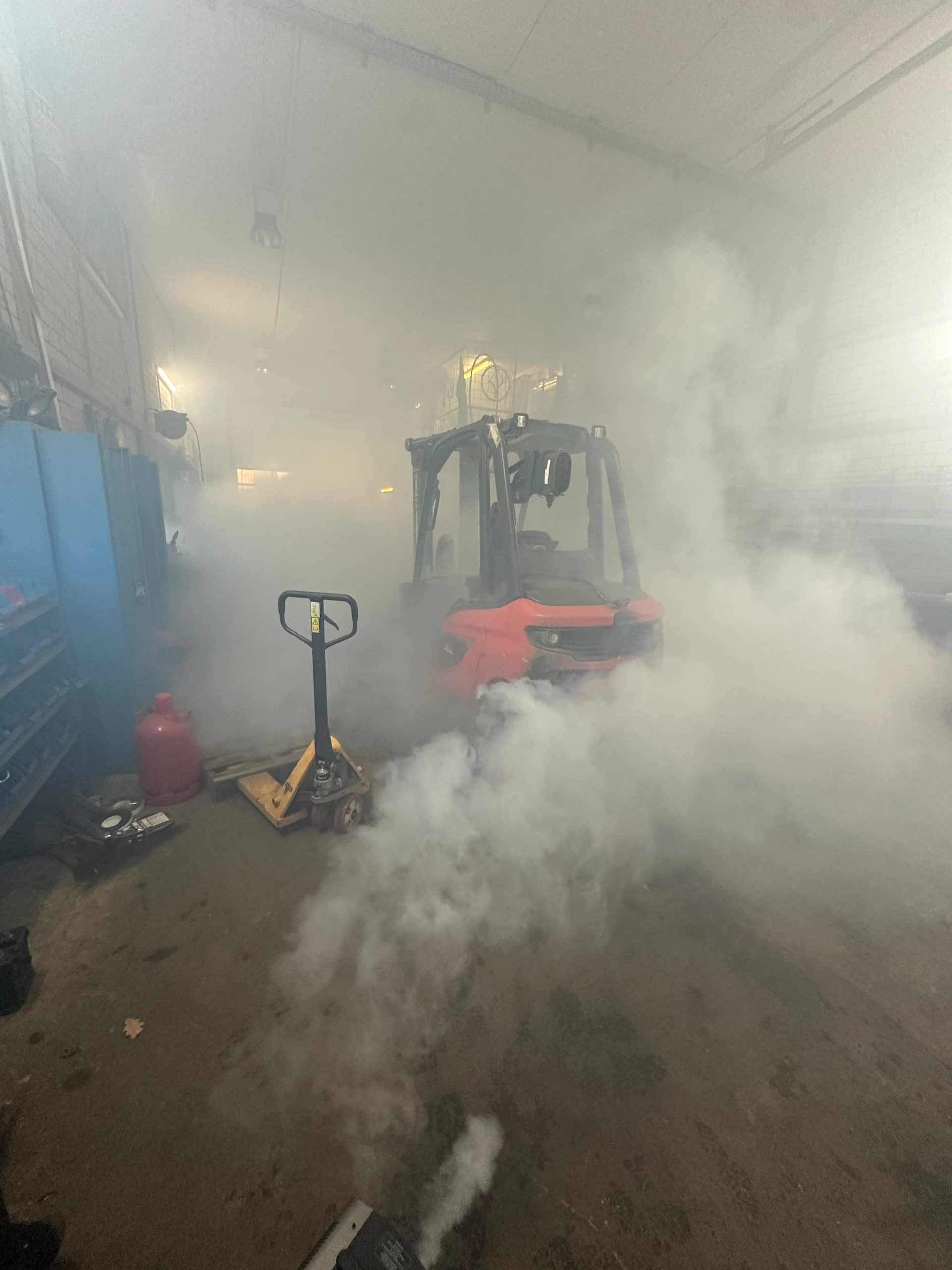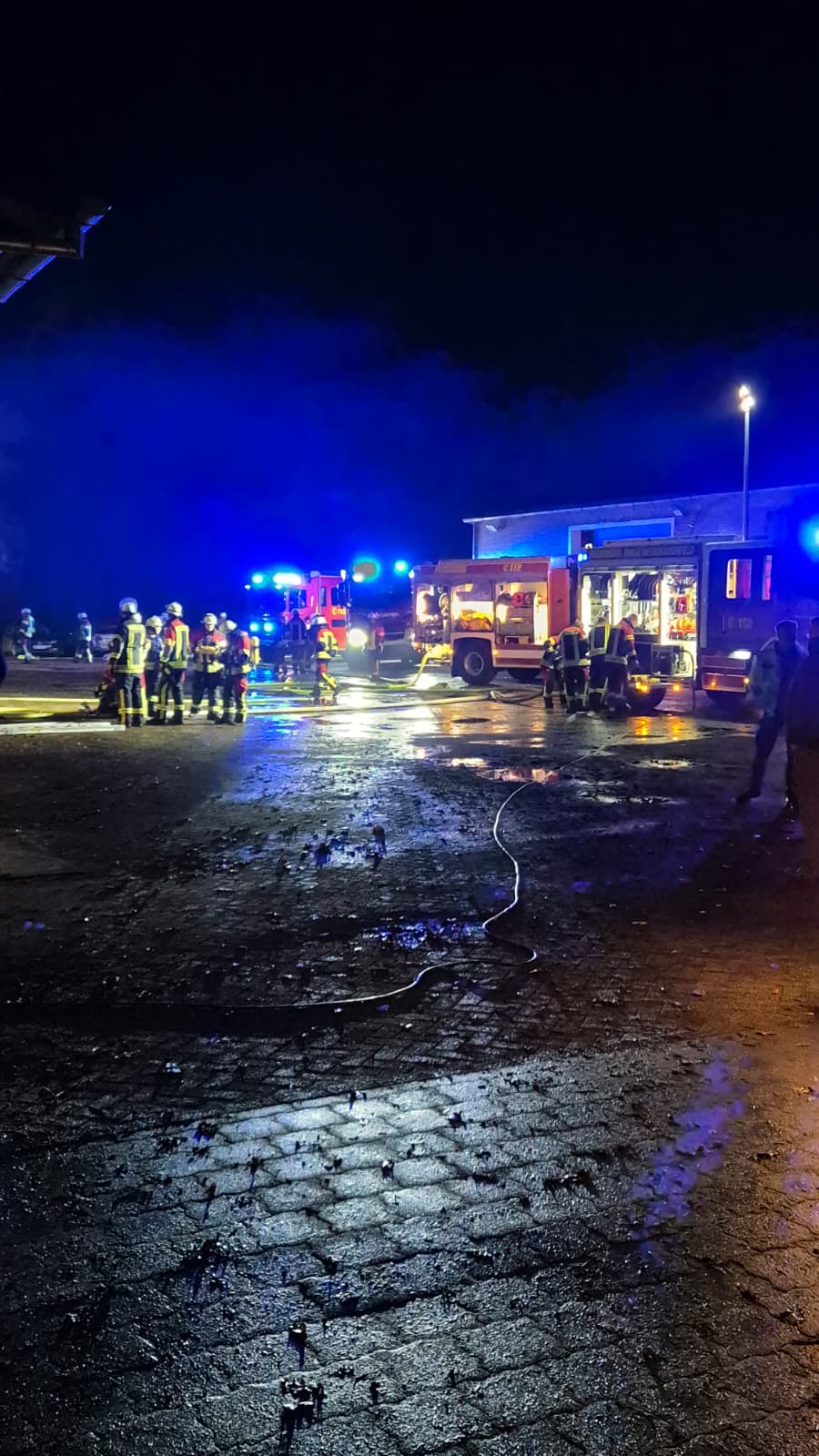 Zum Szenario: In einer Werkstatt ereignete sich eine Explosion. Dabei wurde eine Person unter einer Palette eingeklemmt und die Werkstatt stand in Brand. Trupps unter schwerem Atemschutz retteten die Person und kümmerten sich um die Brandbekämpfung.