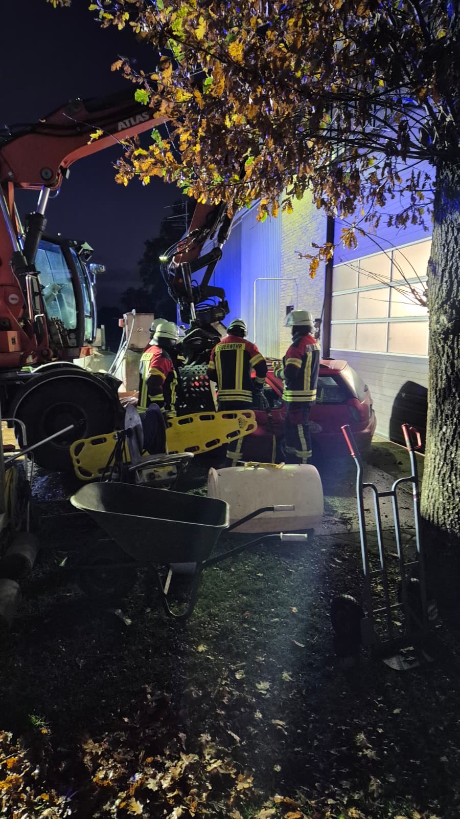 Eine zweite Person wollte dabei zügig mit einem Auto aus der Werkstatt fahren, übersah einen Bagger und blieb darunter stecken (Fahrer eingeklemmt). Die Person wurde mittels schwerem technischen Gerät aus dem PKW befreit.