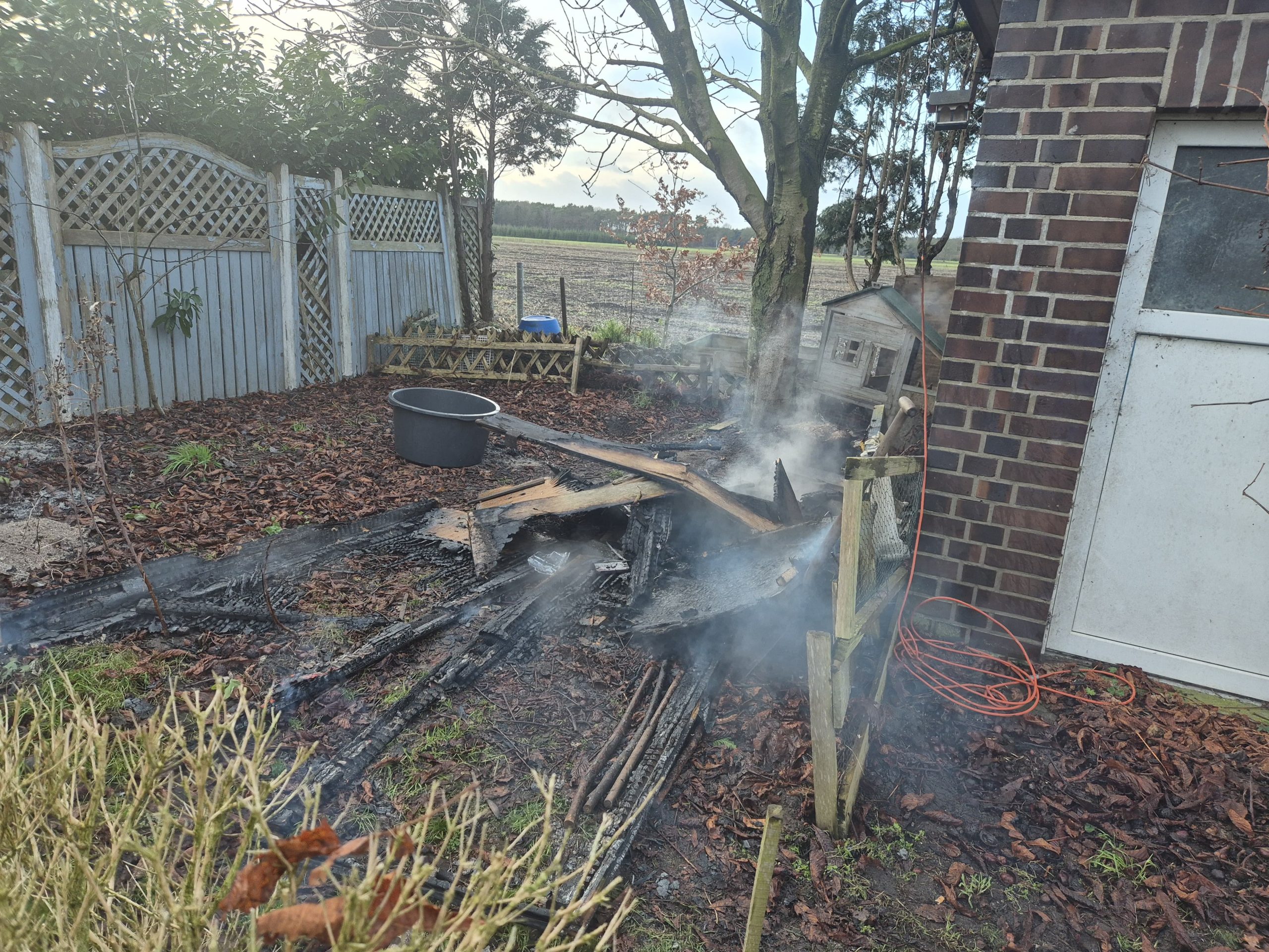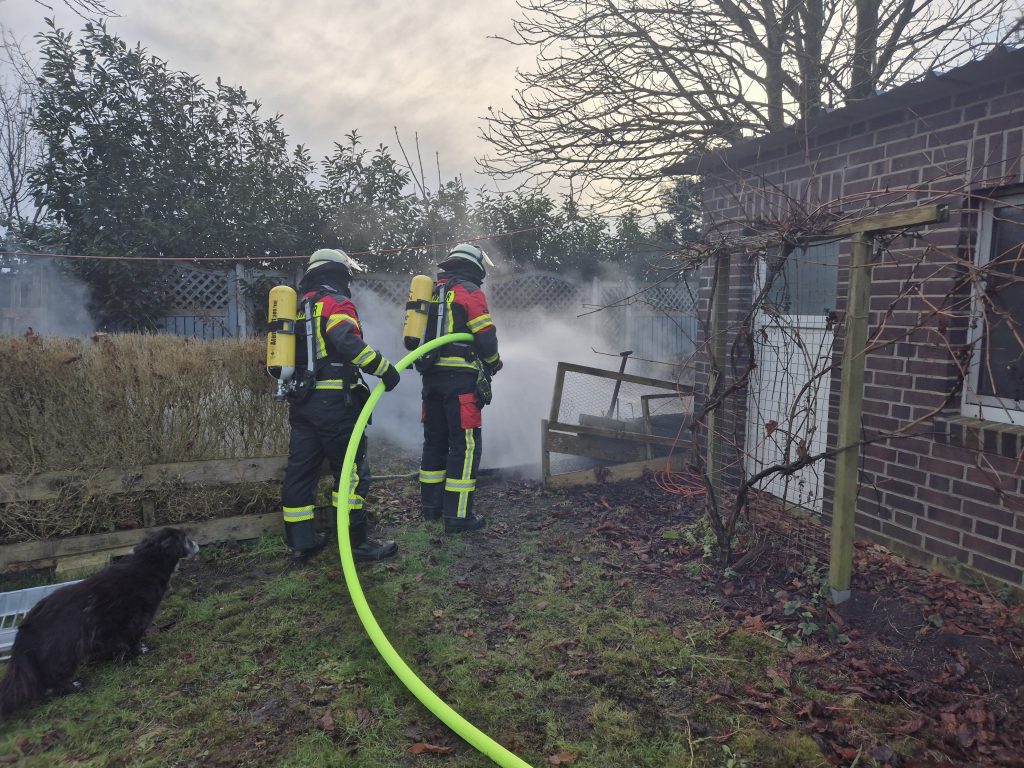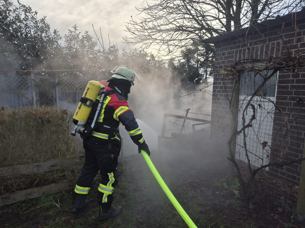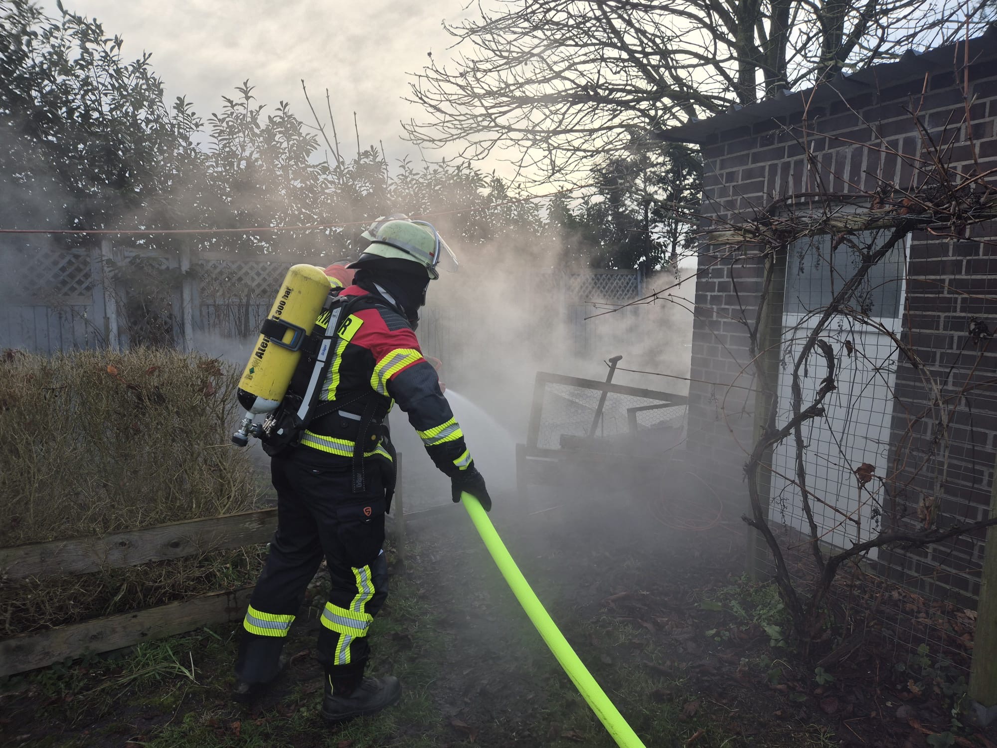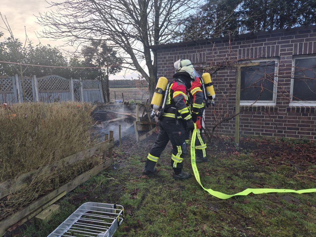 Laut erster Rückmeldung sollte ein Gartenhaus brennen. Beim Eintreffen der ersten Einsatzkräfte brannte lediglich ein Haufen Unrat direkt angrenzend an einen Gartenschuppen. Ein Bewohner konnte gemeinsam mit einem Nachbarn erste erfolgreiche Löschversuche unternehmen. Eine Ausdehnung des Feuers auf den Schuppen konnte verhindert werden. Ein Trupp unter schwerem Atemschutz löschte letzte Glutnester ab und kontrollierte im Anschluss den betroffenen Bereich mit Hilfe der Wärmebildkamera. Die mit alarmierten Einsatzkräfte aus Hoogstede und Emlichheim konnten ihre Einsatzfahrt abbrechen.