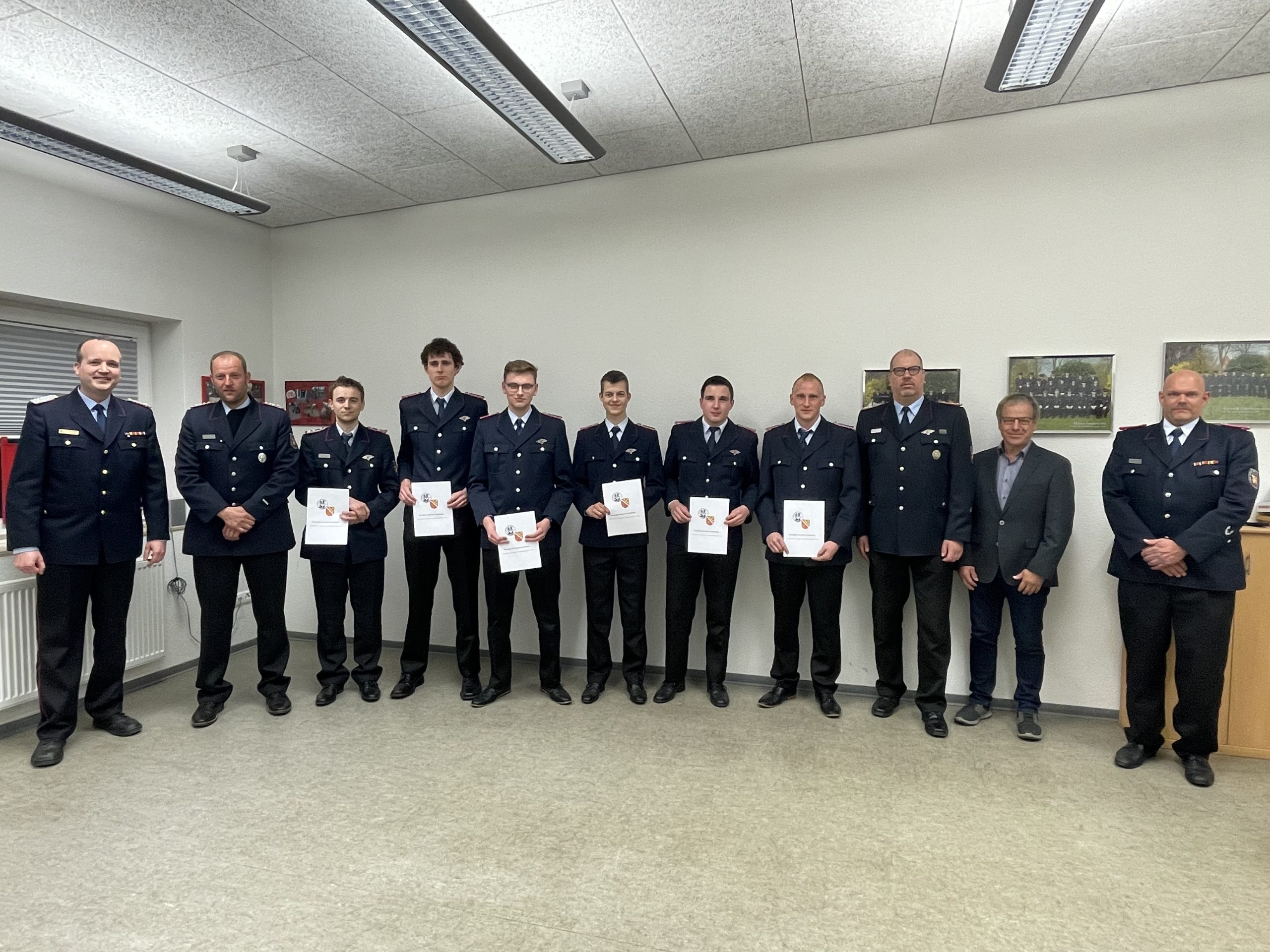 Bildbeschreibung: v.l.n.r.: Kreisbrandmeister Daniel Loehrke, Stellv. Ortsbrandmeister Thomas Hesselink, Max Langius, Bastian Luttermann, Joris Bierlink, Jonas Reefmann, Henk Luttermann, Rainer Kortmann, Gemeindebrandmeister Helmut Tieneken, Bürgermeister Albert Stegeman, Ortsbrandmeister Heiko Züwerink.