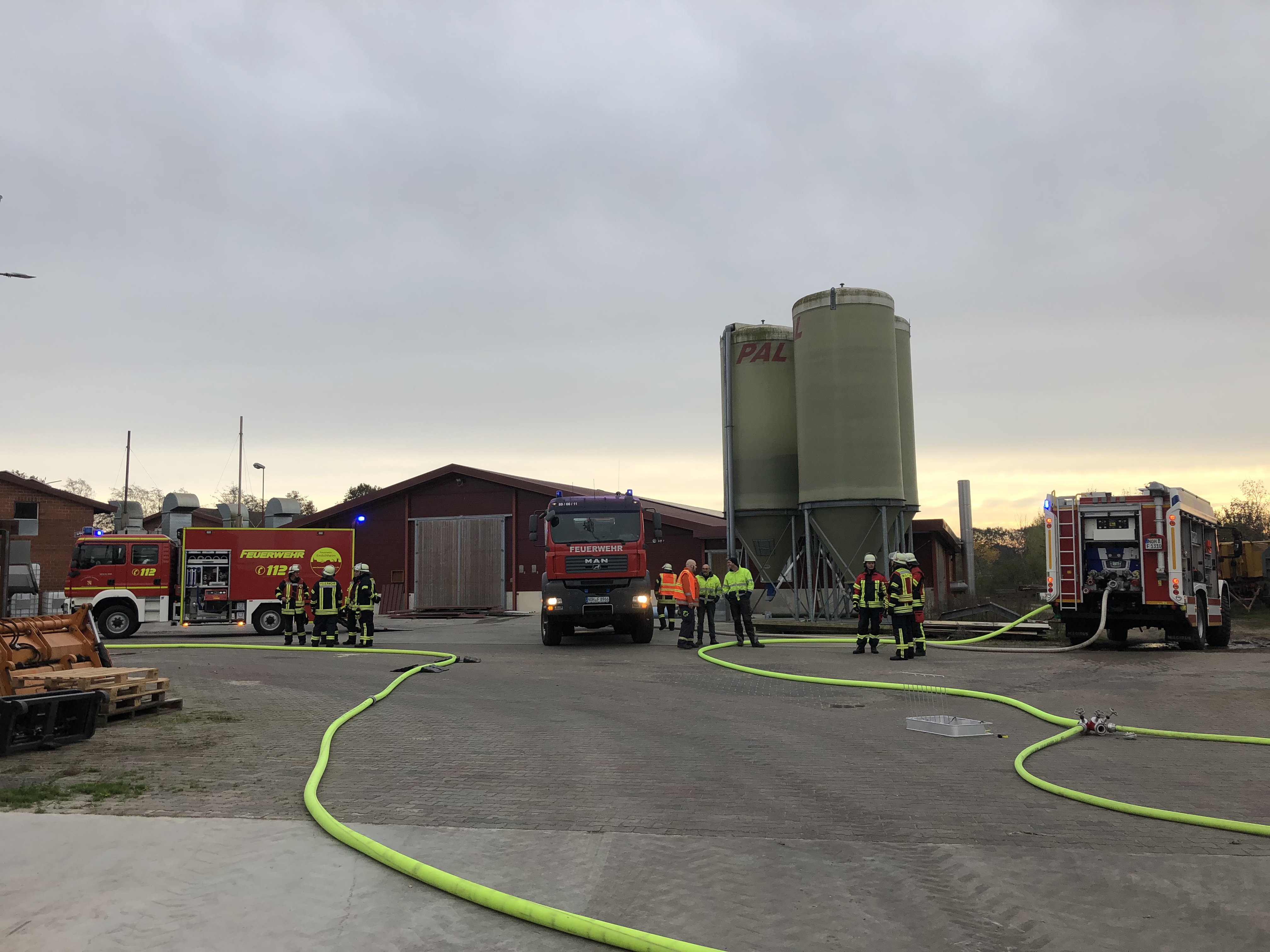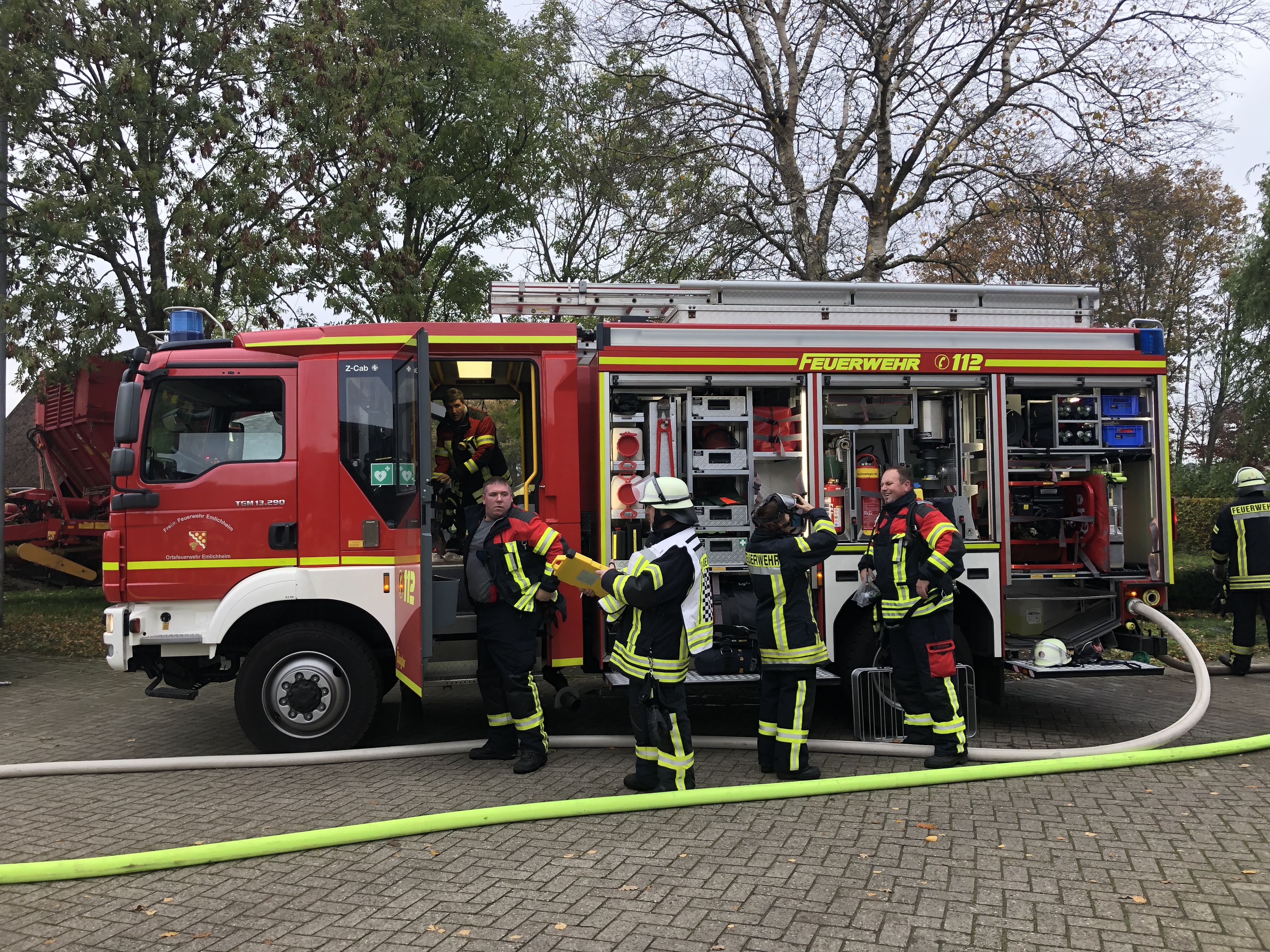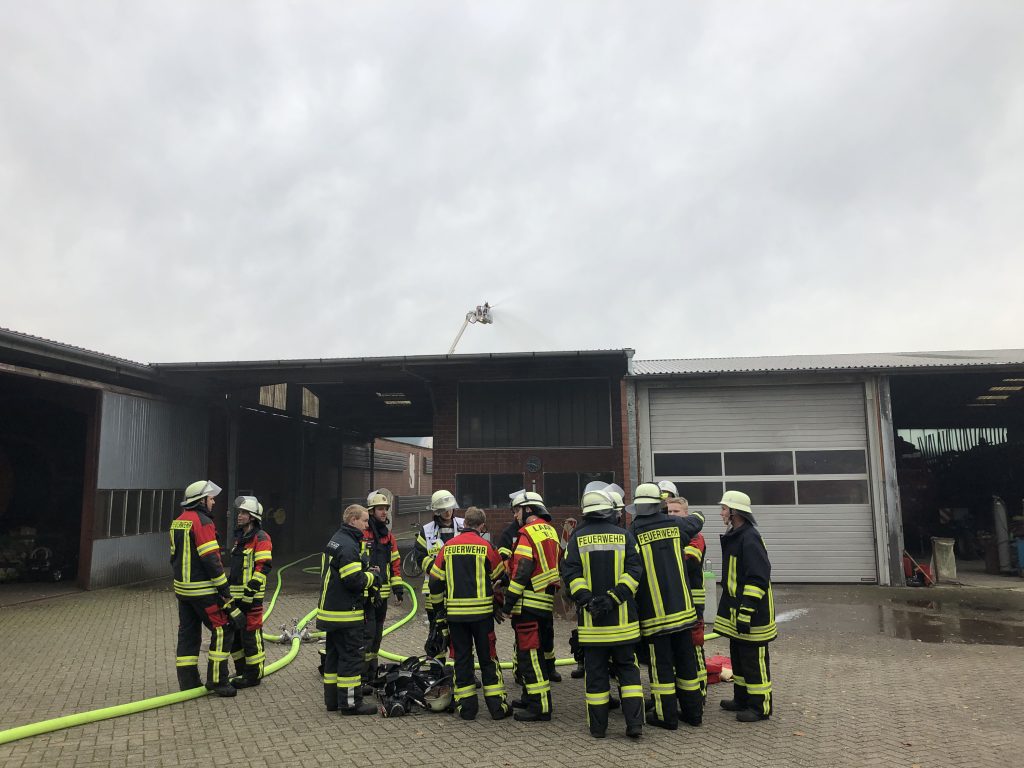 Bei Ankunft der ersten Kräfte wurde es ihnen nach und nach deutlich, dass es sich um eine Einsatzübung handelt. Durch die Gefahr der Brandausbreitung in Richtung der Nebengebäude und der Biogasanlage, entschloss man sich, eine Alarmstufenerhöhung auf F4Y_Gebäude durchzuführen und somit die Ortsfeuerwehr Emlichheim, die Ortsfeuerwehr Ringe/Neugnadenfeld und die Ortsfeuerwehr Hoogstede dazuzurufen. Zudem wurde die Hubrettungsbühne der Brandweer Coevorden, sowie das Wechselladerfahrzeug mit dem Abrollbehälter Tank der Kreisfeuerwehr aus Neuenhaus und der DRK-Ortsverein aus Emlichheim angefordert.