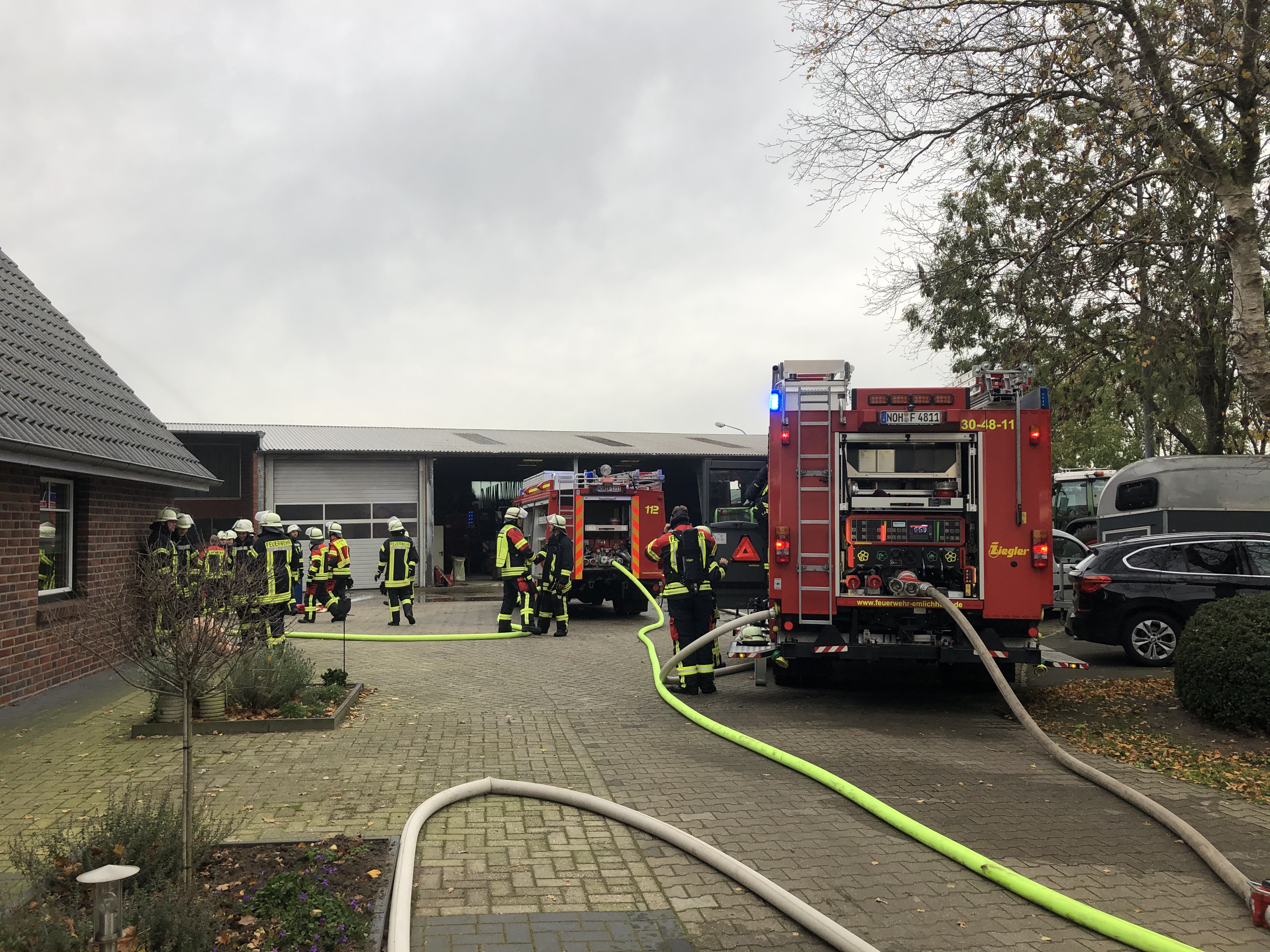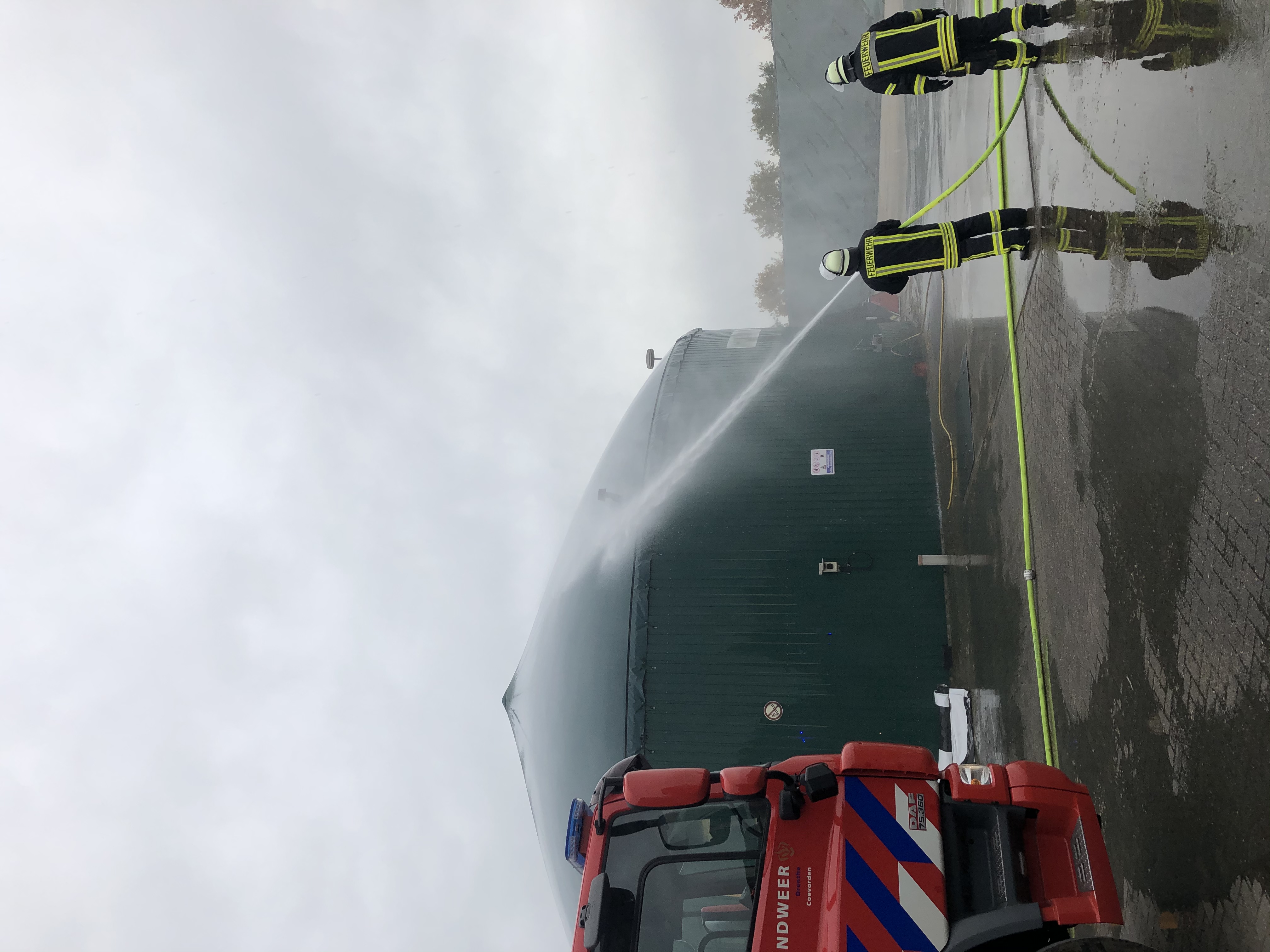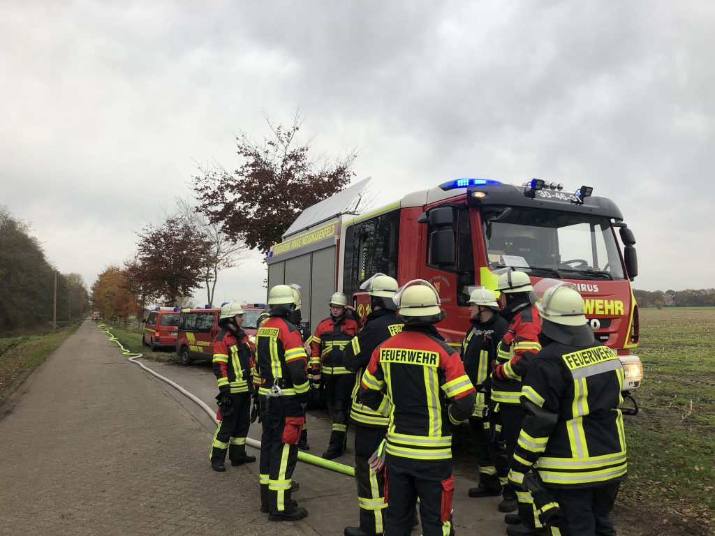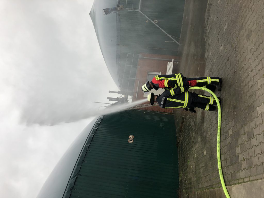 Bei Ankunft der ersten Kräfte wurde es ihnen nach und nach deutlich, dass es sich um eine Einsatzübung handelt. Durch die Gefahr der Brandausbreitung in Richtung der Nebengebäude und der Biogasanlage, entschloss man sich, eine Alarmstufenerhöhung auf F4Y_Gebäude durchzuführen und somit die Ortsfeuerwehr Emlichheim, die Ortsfeuerwehr Ringe/Neugnadenfeld und die Ortsfeuerwehr Hoogstede dazuzurufen. Zudem wurde die Hubrettungsbühne der Brandweer Coevorden, sowie das Wechselladerfahrzeug mit dem Abrollbehälter Tank der Kreisfeuerwehr aus Neuenhaus und der DRK-Ortsverein aus Emlichheim angefordert.