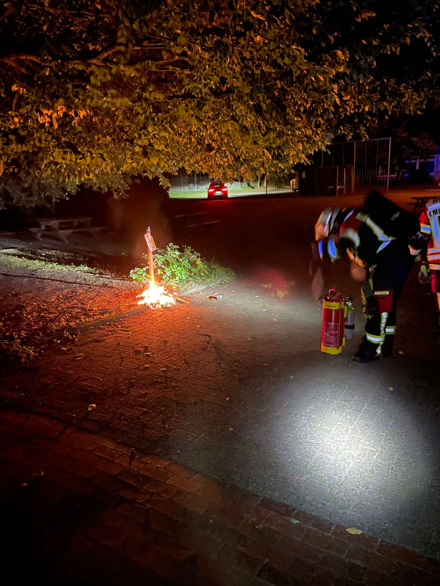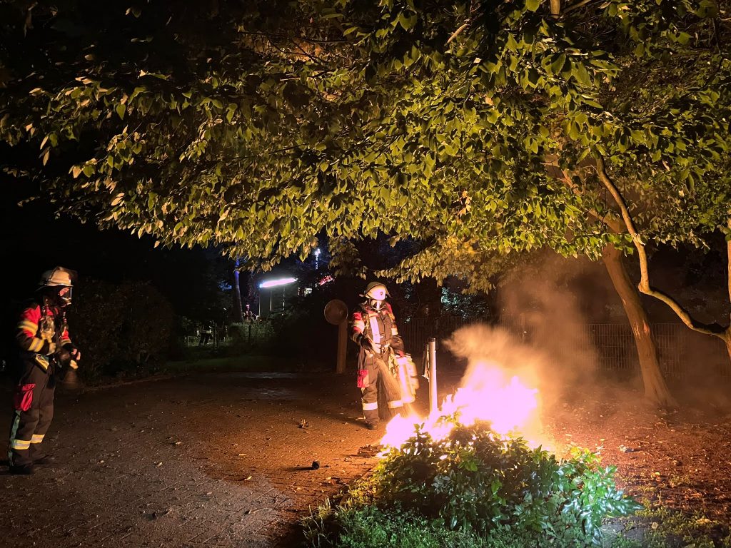 Die zügig angerückten Einsatzkräfte der Ortsfeuerwehr Emlichheim löschten mit Hilfe des High Press den Mülleimer rasch ab. Sie verhinderten zudem ein Übergreifen der Flammen auf einen direkt angrenzenden belaubten Baum.